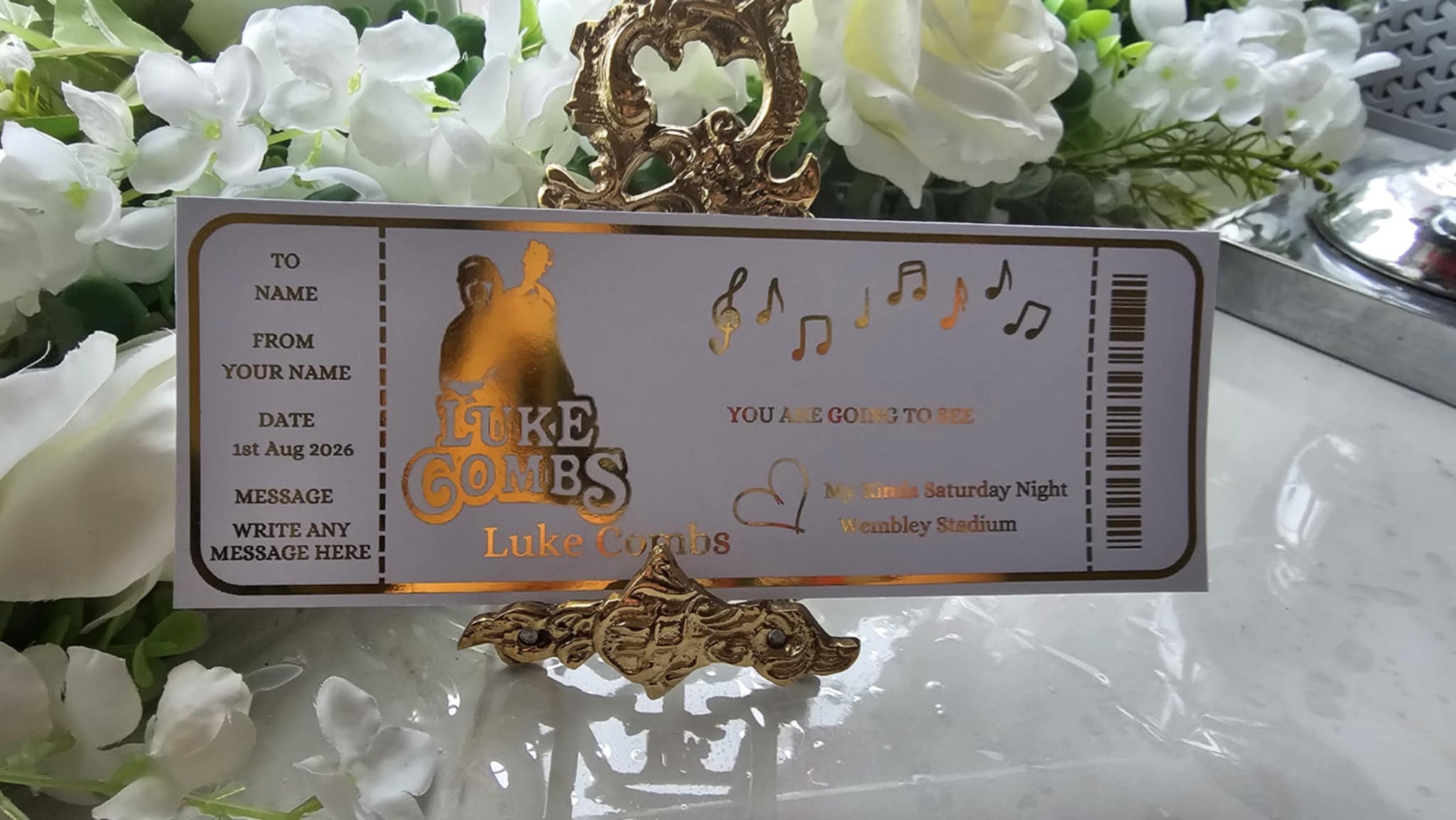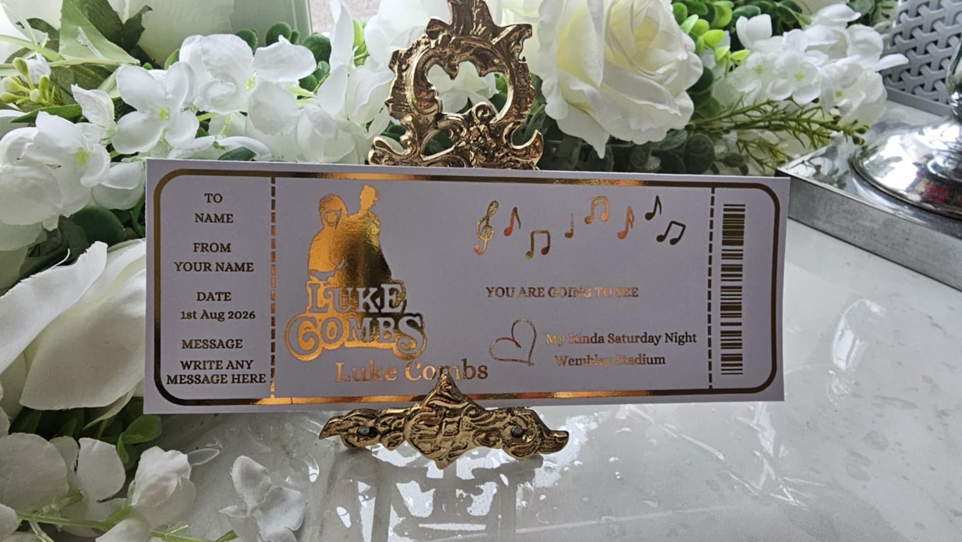 Our personalised Luke Combs foil tickets are perfect for birthdays, surprises, or announcing a night of boots, beers, and belting out every lyric.
